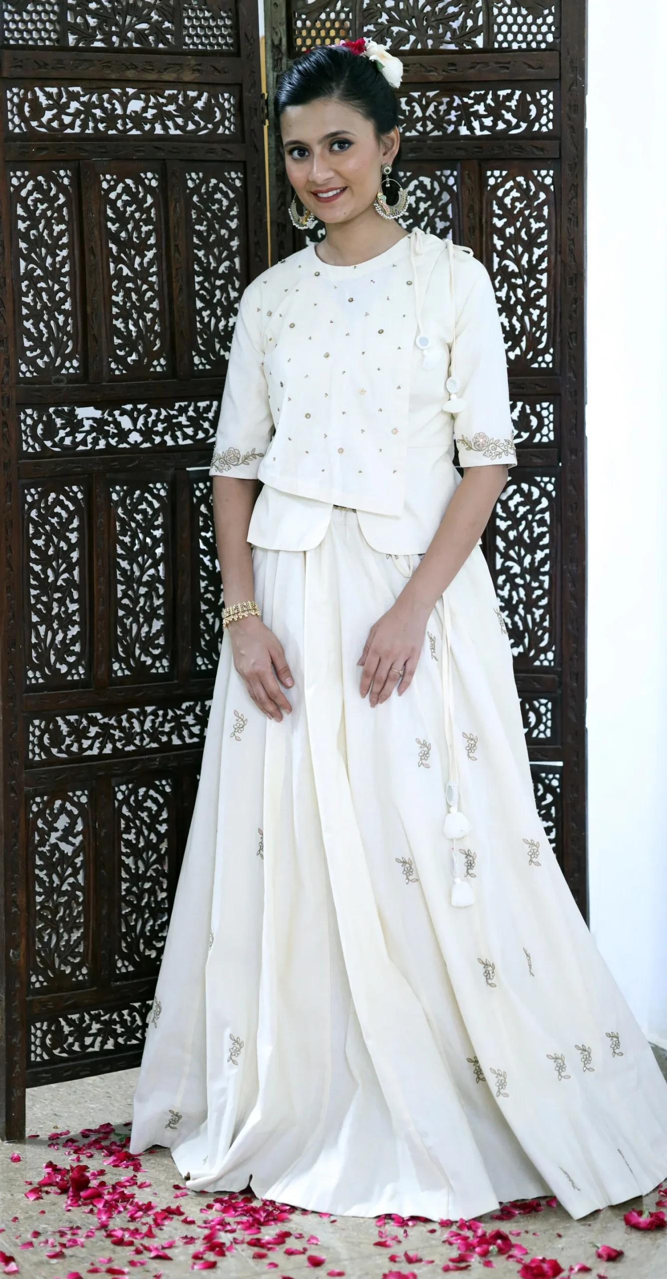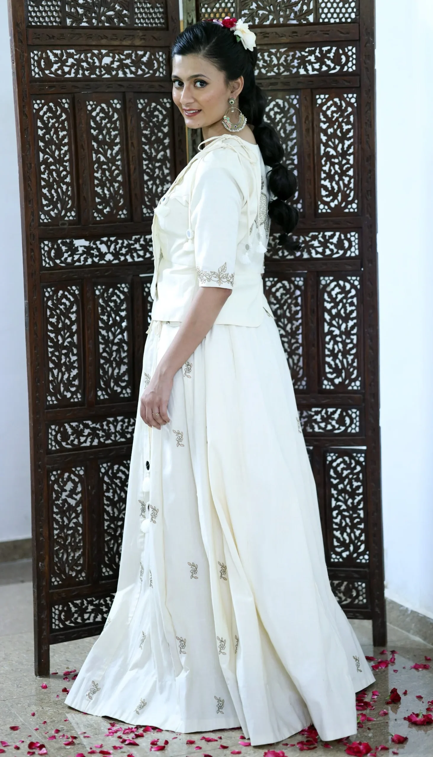 Crafted in soothing off-white khadi, this gamthi-inspired set reflects understated elegance and artisanal charm.