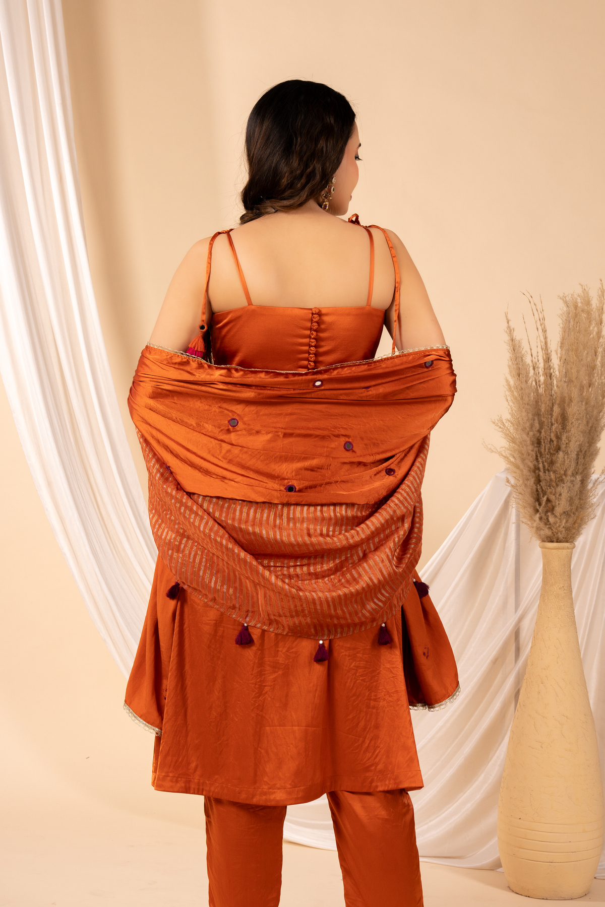 The chunni is a thoughtful blend of texture and tone — one half made of airy tissue fabric that adds a translucent, ethereal softness, and the other half in matching burnt orange satin that anchors the look with richness and depth. The two fabrics come together seamlessly, with scattered mirrors that bridges tradition with modern sensibility.